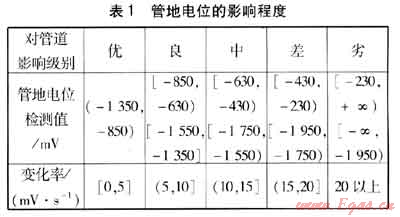 通過實驗研究可知,對于管地電位檢測值U,不同的區(qū)間對管道的腐蝕影響不一樣。當管地電位從-850mV向正的方向偏移時,管道被腐蝕;當管地電位從-1350mV向負的方向偏移時,在陰極區(qū)將發(fā)生析氫反應,對管道的防腐涂層起剝離作用;在區(qū)間(-1350mV,-850mV)時管地電位達到國家標準,此時管道的腐蝕影響為最小,對防腐涂層的影響作用也最小,定義此區(qū)間的管地電位值為優(yōu);在(-850mV,-630mV)區(qū)間,管道有輕微的腐蝕作用;在(-1550mV,-1350mV)區(qū)間,管道的陰極區(qū)將發(fā)生析氫反應,對管道防腐涂層有輕微的剝離作用,此時定義管道的腐蝕影響是良。如此類推,管地電位全部的區(qū)間影響程度見表1。