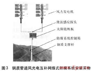 為操作簡單化和防止人為破壞,每臺鋼質(zhì)管道風光電互補網(wǎng)絡式防腐系統(tǒng)安裝在高度為7m的鋼質(zhì)支撐桿上,距地面不得低于5m,其安裝實物用見圖3。