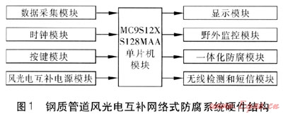 為了實現(xiàn)系統(tǒng)各部分功能,設計一個以單片機為核心控制模塊的防腐系統(tǒng),分為9個功能模塊,分別為單片機模塊、數(shù)據(jù)采集模塊、野外監(jiān)控模塊、顯示模塊、一體化防腐模塊、無線檢測和短信模塊、風光電互補電源模塊、時鐘模塊、按鍵模塊。系統(tǒng)硬件結(jié)構(gòu)見圖1。