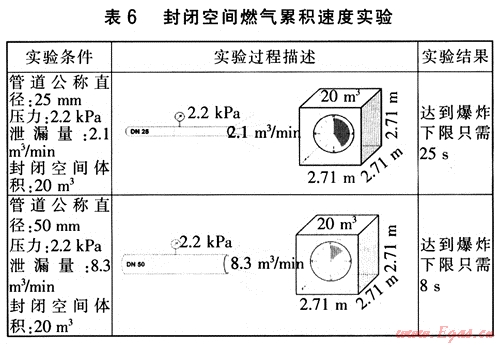 從表6不難看出,燃氣泄漏后在封閉空間的累積速度非常快,這就意味著在封閉空間燃氣泄漏非常危險。