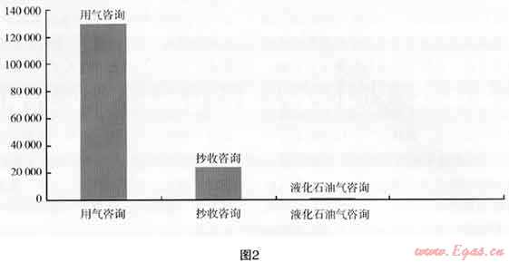 (2) 咨詢類:2010年服務(wù)督察處共受理各類咨詢共154758起(其中藍(lán)焰熱線共受理咨詢類電話153623起,受理外網(wǎng)咨詢1135起),同比增長25%,2009年全年受理咨詢?yōu)?23813起。2010年從整個(gè)咨詢的內(nèi)容來看,主要在以下幾個(gè)方面:用氣知識類咨詢有129403起,如IC卡使用相關(guān)技術(shù)咨詢;燃?xì)饨毁M(fèi)網(wǎng)點(diǎn)和交費(fèi)方式的咨詢;報(bào)修上門的具體時(shí)間咨詢等,共占總體咨詢的84%;抄收類咨詢有24 024起,如咨詢抄表時(shí)間、抄表員電話及查詢客戶號;咨詢?nèi)細(xì)馐召M(fèi);咨詢停送氣具體時(shí)間等,占總體咨詢的15%;液化石油氣類咨詢共1331起,占總體咨詢的1%。如圖2所示。