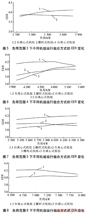 由圖4可知,當負荷范圍為1167~2637kW時,只開啟1臺離心式機組,冷水系統(tǒng)的效率將會達到最高,此時EER為3.70~4.22。由圖5可知,當負荷范圍為2637~2910kW時,初期開啟螺桿式機組+1臺離心式機組的EER略高于開啟2臺離心式機組,但隨著負荷的增加,開啟2臺離心式機組的EER將會逐漸增大至4.13,遠高于開啟螺桿式機組+1臺離心式機組。由于負荷范圍2637~2910kW運行時間較短,在實際運行中,負荷范圍為2637~3804kW時,采用開啟2臺離心式機組的方案。此時,冷水系統(tǒng)的EER為3.78~4.13。由圖6可知,當負荷范圍為3804~5274kW時,采用開啟2臺離心式機組的方案,冷水系統(tǒng)EER最高。由圖7、8可知,當負荷范圍為5274~7911kW時,應開啟3臺離心式機組,此時冷水系統(tǒng)的效率最高。冷水機組最佳運行組合方式見表3。