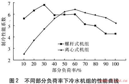 不同部分負荷率下冷水機組的性能曲線見圖2。離心式機組在部分負荷率為60%時制冷性能系數(shù)最大,而后隨著負荷增大而降低。螺桿式機組在滿負荷運行時制冷性能系數(shù)最小,當部分負荷率為30%時最大。