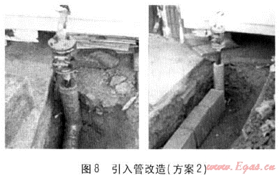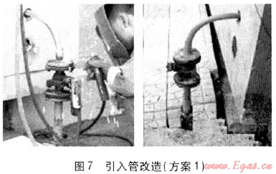 ② 將原有變形管道切割,焊接金屬波紋軟管,見(jiàn)圖7左。
