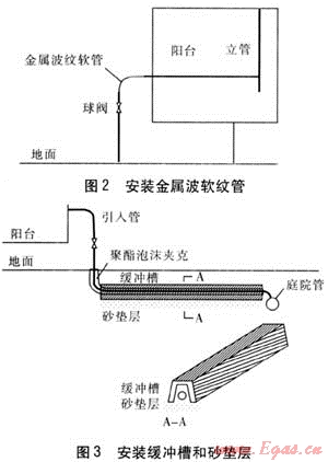 考慮到引入管受力來(lái)源于地面土壤,先在引入管底部增加砂墊層,然后將入地處至庭院管間的管道包裹聚氨酯泡沫夾克,最后在管道頂部加蓋緩沖槽,具體做法見(jiàn)圖3。
