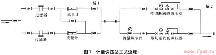 計(jì)量調(diào)壓站工藝流程是:接收高壓管網(wǎng)來(lái)氣,經(jīng)過(guò)濾、計(jì)量、流量調(diào)節(jié)、調(diào)壓后向下游中壓管網(wǎng)供應(yīng)天然氣。計(jì)量調(diào)壓站工藝流程見圖1。