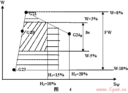 例如英國(guó)經(jīng)過(guò)流動(dòng)試驗(yàn)室對(duì)1200個(gè)天然氣燃具進(jìn)行試驗(yàn),發(fā)現(xiàn)華白數(shù)每遞增1.5MJ/m3,熱水器與鍋爐煙氣中的CO含量大約增加1倍。因此決定燃?xì)饣Q域的華白數(shù)上限為3%,下限為-5%。非正常的界限為:上限8%;下限-10%。英國(guó)使用SNG(代用天然氣),需要用IGU的析碳界限氣G24B檢驗(yàn)。為了避免析碳,英國(guó)要求界限氣中H2含量正常界限為10%,非正常界限為15%。同時(shí)利用W-SW燃?xì)饣Q圖表達(dá)了燃?xì)饣Q域(見圖4),已經(jīng)把IGU規(guī)定的G24B和歐共體的G222排除在外。圖4中的斜線為正?;Q域??梢娪?guó)天然氣的互換域小于IGU和歐共體的天然氣分類的范圍。如果考慮燃?xì)鉄嶂挡辉试S變化過(guò)大時(shí),燃?xì)饣Q域,還要進(jìn)一步縮小。實(shí)際上,燃?xì)饣Q域是根據(jù)燃具的適應(yīng)域等因素決定的,當(dāng)時(shí)英國(guó)燃具的抗析碳的能力差,縮小了互換域。以上是上個(gè)世紀(jì)英國(guó)使用含H2多的SNG(代用天然氣)作為補(bǔ)充氣源的情況[11]。由此可見,界限氣只是給出了互換域邊界的輪廓不等于互換性已經(jīng)解決。