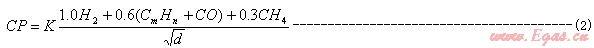 1.燃燒勢(shì)(CP)是反映燃具燃燒狀態(tài)的燃?xì)馓匦詤?shù)。它既反映燃燒速度對(duì)離焰、回火的影響,同時(shí)還反映火焰高度對(duì)煙氣中CO含量的影響。燃燒勢(shì)不是燃燒速度。CP值與燃燒速度也不單純呈比例關(guān)系。這樣看來(lái)稱其為燃燒速度指數(shù)不是非常合適,也容易與韋弗燃燒速度指數(shù)相混[3] 。