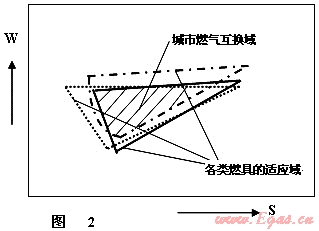 2. 城市燃?xì)饣Q域:一個(gè)城市有多種不同用途的燃具。每種燃具都有自己的燃具適應(yīng)域。將這些適應(yīng)域,集中在一個(gè)坐標(biāo)圖上(見圖2),就可以得到中間斜線的燃?xì)饣Q域。城市供應(yīng)的燃?xì)獗仨氃谶@些燃具的適應(yīng)域的范圍內(nèi)??梢娙?xì)饣Q域是受燃具適應(yīng)域制約的。其實(shí)互換性和適應(yīng)性的目的都是保證燃具正常工作,是一個(gè)事物的兩個(gè)方面?;Q性是對(duì)城市燃?xì)庹f(shuō)的;適應(yīng)性是對(duì)燃具說(shuō)的。在討論時(shí)不要混淆。