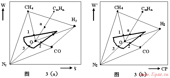 目前,對(duì)燃燒勢(shì)(Combustion Potential)CP有不同的理解。最可靠的解釋還應(yīng)該以德爾布博士在同濟(jì)大學(xué)講課的內(nèi)容為準(zhǔn)。上個(gè)世紀(jì)同濟(jì)大學(xué)請(qǐng)來(lái)德爾布先生來(lái)華講學(xué),還印發(fā)了講課的講義[2]。德爾布先生從大氣式燃燒的穩(wěn)定性講起,最后介紹了燃燒勢(shì)的產(chǎn)生過(guò)程。 德爾布的研究組,開始是使用的是以華白數(shù)為縱坐標(biāo),燃燒速度為橫坐標(biāo)的坐標(biāo)圖,經(jīng)過(guò)試驗(yàn)在此坐標(biāo)圖上點(diǎn)出回火、離焰和CO/CO2超標(biāo)曲線(簡(jiǎn)稱CO曲線)。但是當(dāng)氣源發(fā)展到使用油制氣后,以燃燒速度為橫坐標(biāo)的坐標(biāo)圖上得不到光滑的CO曲線,參見圖3(a)。圖中的a點(diǎn)沒(méi)有落在曲線1上。這是由于燃燒速度不能全面反映CO曲線的結(jié)果。為此需要一個(gè)能反映離焰、回火及CO曲線的參數(shù)(或指數(shù))來(lái)代替燃燒速度S。于是研究組通過(guò)大量試驗(yàn)整理出燃燒勢(shì)CP的公式。將CP 代替S后,得到光滑曲線(具體做法參考[2]、[4])。在W’-CP的圖3(b)中,a值落在曲線1上。說(shuō)明燃燒勢(shì),不僅反映了離焰、回火,同時(shí)還反映了CO曲線。這就是燃燒勢(shì)的物理背景[3]。
