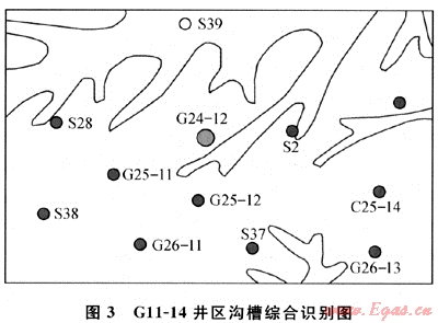 中部氣田溝槽比較發(fā)育,不同級次規(guī)模的樹枝狀溝槽網(wǎng)絡空間分布復雜[11]。由于溝槽對儲層形成切割和側向封擋,會形成明顯的流體滲流邊界。在64口井的測試分析中,有14口井(S3、G24-12、G109、S61、S11、S181、S150、S76、S74、G17-13、G45-6、G23-18、G25-11和G32-4井)表現(xiàn)出了明顯的滲流邊界特征,占總井數(shù)的21.9%。其中,具有平行邊界的井11口,具有開口邊界的井3口(S3、G24-12和G10-9井),這些井外邊界的分析情況大部分與地質上劃定的溝槽相吻合。如G24-12井,2001年3月6日進行了為期31d的壓力恢復測試,實測數(shù)據(jù)導數(shù)曲線的末端持續(xù)上翹,其斜率在1/2和1之間,判斷這應是三面封閉一端開口的“坑道”模型的反映。選用該模型進行擬合,效果很好。通過地質和地震資料進行的溝槽識別結果(圖3)也證明了這一點,即G24-12井不但在其北方有一條一級溝槽,而且在其東邊和西邊還分別受到兩條二級溝槽的“挾持”。