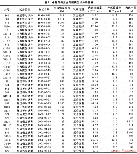 從中部氣田64口測試井解釋結果來看(表2),有26口井的導數(shù)曲線具有均質氣藏特點,而其余的38口井導數(shù)曲線具有復合氣藏的特征,占總井數(shù)的59.4%。在38口復合模型中,復合變好(儲層的遠井地帶物性變好)的有18口井;復合變差(儲層的遠井地帶物性變差)的有20口井。復合模型中,儲層滲透率最高可達63.5×10-3μm2,最低僅為0.15×10-3μm2;內(nèi)區(qū)半徑最小17m,最大1910m,平均294m;這說明本區(qū)儲層平面非均質比較嚴重。