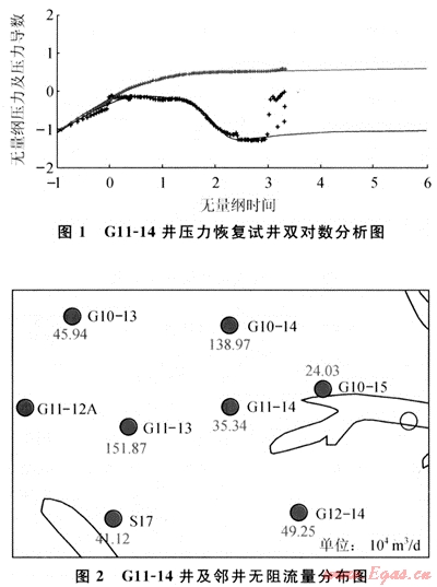 從儲層物性變化特征來看,可將氣藏分為均質氣藏和復合氣藏兩類。G11-14井于1998年1月27日開始進行壓力恢復試井,歷時27d(圖1),圖中實測數(shù)據(jù)的導數(shù)曲線在后期下掉之后又變平,反映了復合氣藏外區(qū)的徑向流特征,說明外區(qū)物性變好。盡管后期曲線中存在急劇上翹的數(shù)據(jù),但這種劇烈程度看來不應是地層的不穩(wěn)定滲流結果,而可能為壓力計或其他因素引起的。試井解釋內(nèi)外區(qū)滲透率分別為7.1×10-3μm2和36.2×10-3μm2,外區(qū)明顯變好,從生產(chǎn)動態(tài)數(shù)據(jù)上也得到驗證(圖2)。