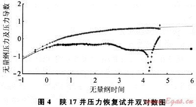 陜17井的雙對數(shù)分析圖(圖4)中實測壓力導數(shù)曲線在壓力恢復的晚期急劇下掉,分析形成該現(xiàn)象的原因在理論上,一是定壓邊界,二是圓形或矩形封閉邊界。但研究該井的壓力恢復歷史數(shù)據(jù)發(fā)現(xiàn)關井恢復到500h之后壓力不升反降,因此,確定這是由于鄰井生產(chǎn)造成的。這樣的井還有G12-5、G34-2、G18-9和G23-2等,這種不穩(wěn)定晚期受到鄰井干擾的情況基本得到了證實。