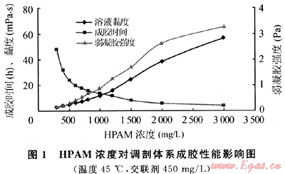 由圖1可見,聚合物濃度增加,體系成膠時(shí)間縮短。同時(shí)形成的弱凝膠強(qiáng)度隨著HPAM濃度的增加而增強(qiáng)。但當(dāng)HPAM濃度大于2000mg/L時(shí),雖然凝膠強(qiáng)度增加到1Pa以上(按凝膠強(qiáng)弱分級(jí)為較強(qiáng)凝膠),但成膠時(shí)間縮短到10h以下,這在大劑量深部處理時(shí)易導(dǎo)致前期調(diào)剖劑段塞反應(yīng)太快而使后面的調(diào)剖劑注入困難。此外,HPAM濃度越高,調(diào)剖體系溶液越黏稠,配制及注入都相對(duì)要困難些。在弱凝膠強(qiáng)度及性能滿足作業(yè)要求條件下,低濃度可獲得較低的成本。但濃度不能低于400mg/L,因?yàn)镠PAM濃度在400mg/L以下時(shí)弱凝膠強(qiáng)度很弱,穩(wěn)定1~2周后有少量的游離水,但弱凝膠HPAM濃度在500mg/L以上時(shí),形成的弱凝膠性能則穩(wěn)定。
