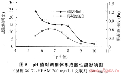 在HPAM/Cr3+交聯(lián)體系中,pH值對(duì)體系溶液是否成膠有著決定性的影響,對(duì)HPAM—YG102-3交聯(lián)體系成膠性能影響實(shí)驗(yàn)結(jié)果見表1、圖5。