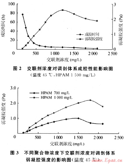 由圖2、圖3可見,聚合物濃度一定時(shí),交聯(lián)劑濃度增加,體系成膠時(shí)間縮短,形成的弱凝膠強(qiáng)度增加,這是因?yàn)榻宦?lián)劑濃度增加,聚合物交聯(lián)機(jī)會(huì)及弱凝膠分子間交聯(lián)密度增加所致。但交聯(lián)劑濃度過(guò)高時(shí),體系形成的弱凝膠反而有所降低,長(zhǎng)期放置觀測(cè)發(fā)現(xiàn)弱凝膠不穩(wěn)定,有輕微脫水現(xiàn)象。這是因?yàn)榻宦?lián)劑濃度過(guò)高,體系反應(yīng)形成凝膠后,溶液內(nèi)部的活性基團(tuán)與交聯(lián)劑之間的化學(xué)反應(yīng)仍在進(jìn)行,這會(huì)使凝膠的交聯(lián)點(diǎn)增加,交聯(lián)密度增大導(dǎo)致凝膠的分子線團(tuán)發(fā)生收縮,從而出現(xiàn)脫水和破膠現(xiàn)象。同時(shí)交聯(lián)劑濃度太小時(shí),體系交聯(lián)不充分或不能有效地進(jìn)行交聯(lián),形成的凝膠太弱或不能形成整體凝膠,用于調(diào)剖難以形成有效的堵塞。此外聚合物濃度越高,形成穩(wěn)定弱凝膠要求的交聯(lián)劑也相應(yīng)增加。用于裂縫凝析氣藏調(diào)剖作業(yè)的弱凝膠,一般要求弱凝膠強(qiáng)度稍高,在1Pa以上。HPAM在1000mg/L以上,調(diào)剖劑最佳交聯(lián)劑濃度確定在450~900mg/L,該調(diào)剖體系形成的弱凝膠穩(wěn)定,弱凝膠在地層中可移動(dòng),從而達(dá)到調(diào)剖目的。