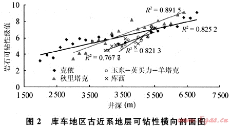 由圖3所示,庫(kù)車地區(qū)白堊系地層可鉆性級(jí)值克依構(gòu)造區(qū)帶與秋里塔克構(gòu)造區(qū)帶較大,主要分布在6~9級(jí),屬于難鉆地層,而玉東-英買力-羊塔克地層可鉆性級(jí)值主要分布在5~8級(jí);從回歸分析趨勢(shì)來(lái)看,克依構(gòu)造與秋里塔克構(gòu)造增加趨勢(shì)相近,玉東-英買力-羊塔克地層與庫(kù)西地區(qū)增加趨勢(shì)相近,但增加趨勢(shì)大于前兩者;從擬合數(shù)值來(lái)看,克依構(gòu)造地層可鉆性級(jí)值最大,秋里塔克次之,再次為庫(kù)西地區(qū),玉東-英買力-羊塔克構(gòu)造區(qū)帶最小,只有在井深達(dá)到6000m左右,4個(gè)構(gòu)造區(qū)帶地層可鉆性級(jí)值才較為接近。