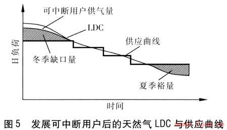 通過市場手段來減少城市天然氣冬季缺口量是燃氣企業(yè)的常用做法[3],即發(fā)展季節(jié)可中斷用戶。通過季節(jié)可中斷用戶用氣量的調節(jié),使冬季缺口量減少(即LDC的最高點降低,見圖5),減少了補充氣源在供氣高峰時的日供應量,從而降低相應的工程設施造價及其運行管理費用。