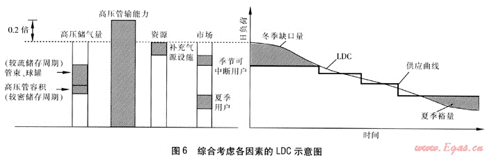 圖6的右邊反映出在照付不議供氣合同氣量與市場需求不一致的情況下,可能出現(xiàn)的冬季缺口量和夏季裕量,以及春秋季節(jié)某些天的供需不平衡,利用LDC有助于規(guī)劃各類氣源供應以及市場發(fā)展策略。在圖6的左邊,有市場、資源、高壓管輸能力和高壓儲氣量4根柱狀圖。高壓儲氣量柱狀圖顯示:球罐和管束等對儲氣壓力有調節(jié)手段,能應付變化幅度較大的調峰,對應右邊LDC腰部的位置;高壓輸氣管道只有小時調峰能力而無季節(jié)調峰能力。高壓管輸能力柱狀圖比LDC最高點高出0.2倍,是提醒設計時應考慮管輸能力比年最大用氣量目的用氣需求負荷高20%。資源柱狀圖表示解決冬季缺口量所需的工程手段,即補充氣源設施規(guī)劃。若冬季缺口量全部由工程手段解決將會使補充氣源設施龐大,造價高,且補充氣源全成本較高也會增加燃氣企業(yè)的運行費用。因此,應從需求側(市場)做出規(guī)劃,即大力發(fā)展季節(jié)可中斷用戶,謹慎發(fā)展壁掛爐用