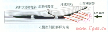 從實(shí)際地震剖面與物理模擬的結(jié)果對(duì)比圖(圖3-b、c)來(lái)看,該實(shí)驗(yàn)基本將阿瓦特段的構(gòu)造變形情況真實(shí)地再現(xiàn)了出來(lái),物理模擬的構(gòu)造形態(tài)與地震剖面基本一致:鹽下發(fā)育4排疊瓦逆沖斷層,與地震剖面一致;物理模擬剖面斷層傾角約30°,地震剖面斷層傾角40°,二者基本吻合。該實(shí)驗(yàn)在邊界條件的設(shè)計(jì)上和構(gòu)造變形的過(guò)程上與真實(shí)情況基本一致,符合相似性原則,可以作為對(duì)該地區(qū)構(gòu)造解釋的有效證據(jù)。