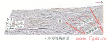 圖4-c、d、f為物理模擬實(shí)驗(yàn)的解釋方案與實(shí)際地震資料解釋方案的對(duì)比,顯然只有早期存在鹽底辟的模擬實(shí)驗(yàn)結(jié)果與地震剖面吻合,早期不存在鹽底辟的