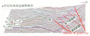 1)吐孜阿瓦特鹽下發(fā)育逆沖斷層,鹽上發(fā)育寬緩背馱向斜。分為3個(gè)帶:山前單斜帶、鹽下斷褶帶、前緣隆起帶。