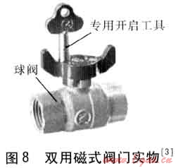 圖8所示閥門為可實現(xiàn)可關(guān)不可開或可自由開關(guān)與可關(guān)不可開互換功能的雙用磁式產(chǎn)品,當(dāng)閥門處于可關(guān)不可開狀態(tài)時,須通過專用開啟工具才能實現(xiàn)自由開關(guān)。該結(jié)構(gòu)關(guān)鍵技術(shù)在于閥體凸頸部有兩凸臺,凸臺上有平行凸頸中心線的盲孔,手柄正上端面設(shè)有A和B標(biāo)志的兩螺紋孔以及帶強(qiáng)磁的A和B的螺塞。當(dāng)閥門需要從關(guān)閉到開啟狀態(tài)實現(xiàn)可關(guān)不可開的功能時,只需通過專用開啟工具將手柄上A螺紋孔安裝B螺塞或B螺紋孔安裝A螺塞或A、B螺塞任意去掉其中一個或A、B螺塞都不安裝,即可實現(xiàn);當(dāng)閥門需要實現(xiàn)可自由開關(guān)與可關(guān)不可開互換的功能,只需通過專用開啟工具將手柄上A螺紋孔安裝A螺塞或B螺紋孔安裝B螺塞,利用磁場“同性相斥,異性相吸”的原理,即可實現(xiàn)作為普通閥門自由開關(guān)功能。產(chǎn)品出廠一般設(shè)置為可關(guān)不可開的狀態(tài)。