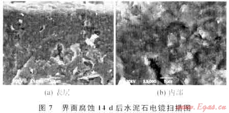 圖6和圖7分別是1MPa C02+3MPa H2S環(huán)境下水泥石界面腐蝕7d和14d后水泥石的微觀電鏡照片。