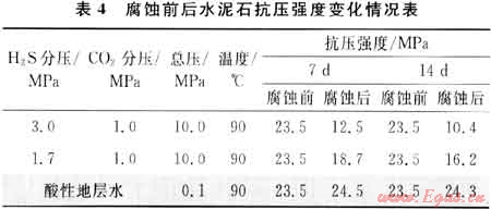 表4是指定水泥石在水濕H2S+C02復(fù)合酸性氣體環(huán)境及酸性地層水中界面腐蝕7d和14d后抗壓強度變化情況。