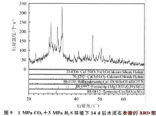 圖8、9是1MPa C02+3MPa H2S環(huán)境下水泥石界面腐蝕7d和14d后X射線衍射成果圖(XRD)。