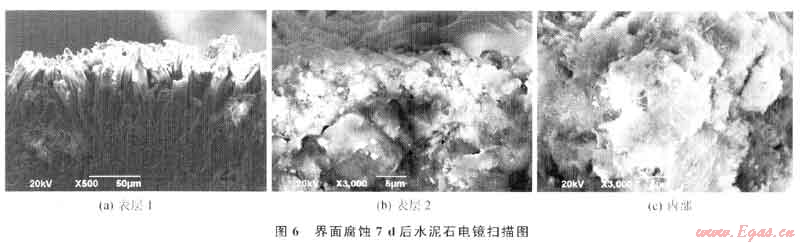 由顯微照片圖6-a可以看到腐蝕后的水泥石表面包裹著一層腐蝕產(chǎn)物,由掃描電鏡(sEM)看出該包被層屬于致密性的。在致密包被層的下面是水泥石的內(nèi)部結(jié)構(gòu),由圖6、7對比看出,腐蝕后的水泥石內(nèi)部結(jié)構(gòu)相對致密層來說較為疏松,能觀察到部分較大的孔洞,這些孔洞可能是腐蝕介質(zhì)和水泥石中的水化產(chǎn)物反應(yīng)留下的,同時反應(yīng)的腐蝕產(chǎn)物通過孔洞和凝膠孔等被運移到水泥石的表面,最終使水泥石的表面形成致密包被層。