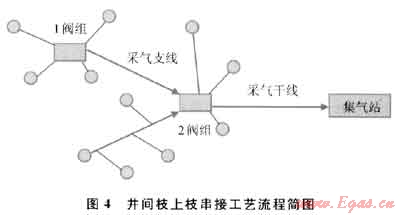 首次在煤層氣氣田工程中采用了多種井間串接方式,單井不必直接敷設(shè)進(jìn)站,而是根據(jù)地形、地貌、井型等情況,通過采氣支管把相鄰的幾口氣井靈活串接到采氣干管,匯合后集中進(jìn)站。這種井間枝上枝的串接工藝縮短了采氣管線長度,增加了集氣站的集氣半徑,降低了管網(wǎng)投資,減少了對植被的破壞,提高了采氣管網(wǎng)對氣田滾動開發(fā)的適應(yīng)性。圖4為井間枝上枝串接工藝流程簡圖。