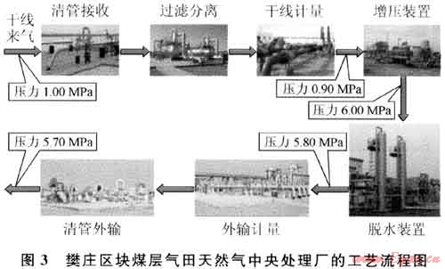 所有樊莊區(qū)塊煤層氣通過采氣管網(wǎng)收集到集氣站,再由集氣站增壓輸送到天然氣中央處理廠,經(jīng)集中凈化處理后輸送到“西氣東輸”主干道。煤層氣集中處理,提高了處理系統(tǒng)的規(guī)模效果;煤層氣規(guī)?;廨?,有利于資源統(tǒng)一調(diào)配,充分利用好煤層氣資源[8]。