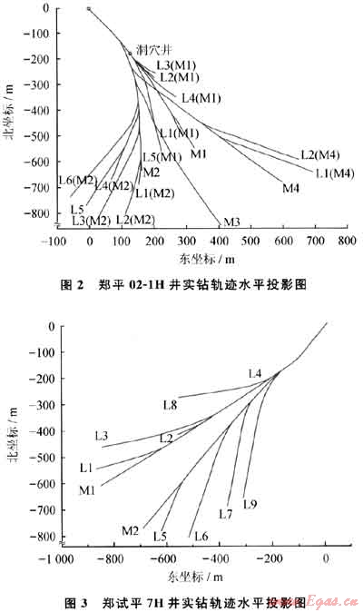 鄭平02-1、鄭平05-1、鄭試平4H和鄭試平7H井是沁水盆地南部斜坡高階煤層氣田鄭莊區(qū)塊上部署的多分支水平井,鉆井過程中,使用清水作為循環(huán)介質(zhì),并從洞穴直井充氣幫助攜帶巖屑。鄭平02-1H井施工過程中,曾因煤層垮塌,造成環(huán)空循環(huán)通道堵塞,導(dǎo)致兩次卡鉆事故。L5分支井眼鉆進(jìn)過程中因井壁垮塌嚴(yán)重、井眼上下交錯復(fù)雜,在M1主井眼上已經(jīng)沒有側(cè)鉆點(diǎn),鉆出的分支又無法重入。反復(fù)論證后,改變原設(shè)計(jì),在洞穴前面的主井眼側(cè)鉆一個(gè)主分支,在該主分支上繼續(xù)側(cè)鉆分支井(圖2)。鄭平05-1H井在施工過程中發(fā)生卡鉆事故2起,損失時(shí)間419h,占總時(shí)間的16.51%;第二次卡鉆事故解除后,因821~894m井段煤層垮塌嚴(yán)重,井下情況復(fù)雜,被迫在760m開窗側(cè)鉆。