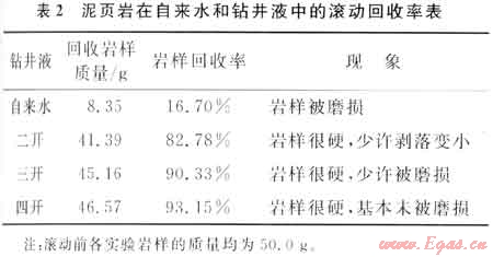 按照石油天然氣行業(yè)標(biāo)準(zhǔn)SY/T 5613—2000《泥頁巖理化性能試驗方法》中的標(biāo)準(zhǔn)滾動回收率法評價了群6井失穩(wěn)井段(4400~4500m)的泥頁巖在不同的鉆井液及自來水中的滾動回收率,分析其在不同介質(zhì)中的分散性。實驗結(jié)果如表2所示。