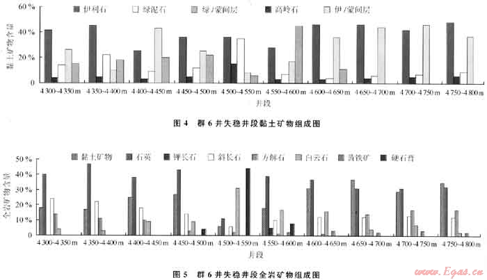 由圖5可以看出,群6井失穩(wěn)井段的全巖礦物以石英(相對含量介于11%~47%)、黏土礦物(相對含量介于6%~37%)、斜長石(相對含量介于6%~24%)、方解石(相對含量介于1%~17%)、白云石(相對含量介于3%~31%)為主,還含少量的鉀長石、石膏和黃鐵礦,缺失方沸石、菱鐵礦和鹽巖。同時處于4500~4550m井段的地層硬石膏相對含量較高,達(dá)到了44%,屬石膏泥巖層,當(dāng)鉆井過程中鉆遇到該地層時,鉆井液液柱壓力不能平衡地層坍塌壓力,地層在地層坍塌壓力作用下向井眼擠壓,或者鉆井液中抗鹽抗鈣處理劑加量不足,使石膏吸水膨脹、分散,從而造成井下坍塌、掉塊、卡鉆等鉆井復(fù)雜事件。