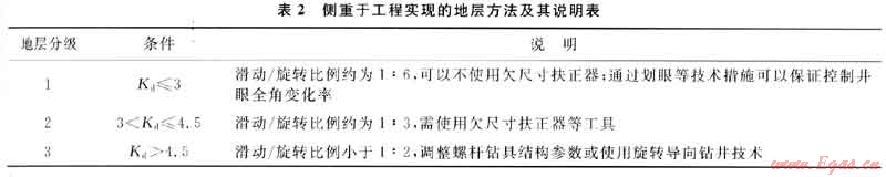 基于上述認識,可進而提出以工程實現(xiàn)能力為依據(jù)的地層分級方法。即根據(jù)井眼尺寸和地層對于鉆井手段的響應效果進行分級。例如,在大牛地氣田,根據(jù)地層可鉆性級值,Φ215.9mm井眼可以將地層分為3級(圖3)。地層可鉆性級值(Kd)小于3的可劃分為I級,對應的復合鉆進全角變化率小于3.5°/100m,即復合鉆進60m,井斜最大增加2.1°,使用1.25°單彎動力鉆具滑動鉆進10m左右即可控制井眼軌跡?;瑒鱼@進與旋轉(zhuǎn)鉆進的比例接近1:6。實際施工中,當所鉆地層Kd<3時,可以使用“鉆頭+單彎螺桿動力鉆具+無磁鉆具+……”的常用鉆具組合,通過多次劃眼、控制鉆壓等方法均可有效降低復合鉆進井段的全角變化率。根據(jù)地層可鉆性級值選擇底部鉆具組合及井眼軌跡控制的方法見表2。