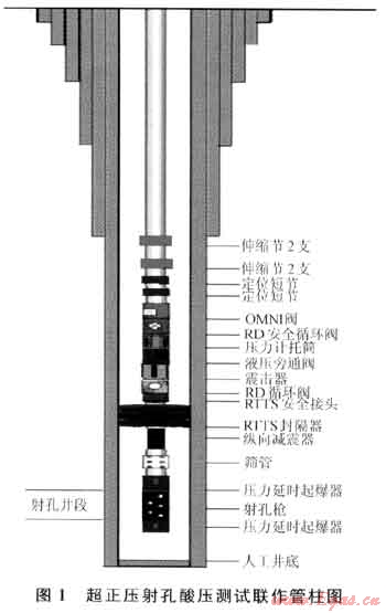 超正壓射孔酸壓測(cè)試管柱如圖1所示,主要用于射孔后立即進(jìn)行改造的儲(chǔ)層,一般是儲(chǔ)層物性較好、通過改造可獲得理想產(chǎn)能的儲(chǔ)層。充分利用超正壓射孔產(chǎn)生的高壓聚能流體對(duì)地層形成的微裂縫,降低注酸初始?jí)毫?。該三?lián)作工藝,不僅能縮短施工周期、成果見效快、有效降低測(cè)試成本,而且能減少射孔后壓井液對(duì)地層的二次污染。