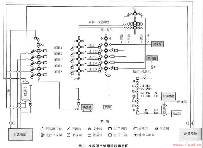 2) 采用三級(jí)節(jié)流測(cè)試流程,充分利用鉆井壓井和節(jié)流管匯與測(cè)試流程組成壓井、堵漏管網(wǎng),配齊備用液控平板閥和節(jié)流閥、油嘴套和油嘴。