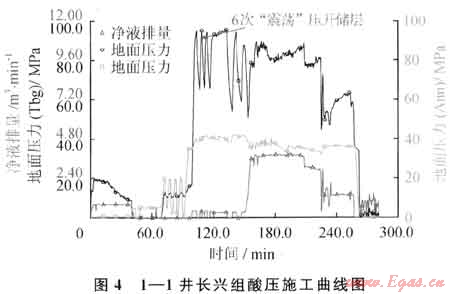 利用“沖擊波”原理,形成了異常高破裂壓力儲(chǔ)層的震蕩注入酸壓工藝,該工藝?yán)每焖偬岣呤┕毫r(shí)產(chǎn)生的“沖擊波”(壓力峰值是顯示值的2~5倍)對(duì)儲(chǔ)層應(yīng)力集中不斷進(jìn)行釋放,實(shí)現(xiàn)降低破裂壓力目的。該工藝成功用于1-1井長(zhǎng)興組,經(jīng)過6次高壓震蕩成功壓開儲(chǔ)層(圖4),酸壓后增產(chǎn)天然氣50.2×104m3/d。