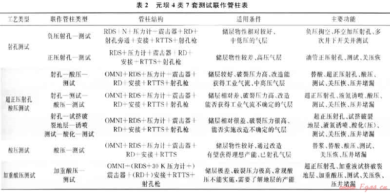 利用地震、鉆井、錄井、測(cè)井等資料,在研究區(qū)域構(gòu)造、砂體展布、地層壓力及溫度、含油氣情況、儲(chǔ)層特征等基礎(chǔ)上,針對(duì)不同的測(cè)試目的,形成了以“超正壓射孔酸壓測(cè)試技術(shù)”[4]為核心的4類7套優(yōu)快APR測(cè)試技術(shù)(表2)。對(duì)深度大于6000m的氣井,改造管柱需增加2組伸縮短節(jié)。