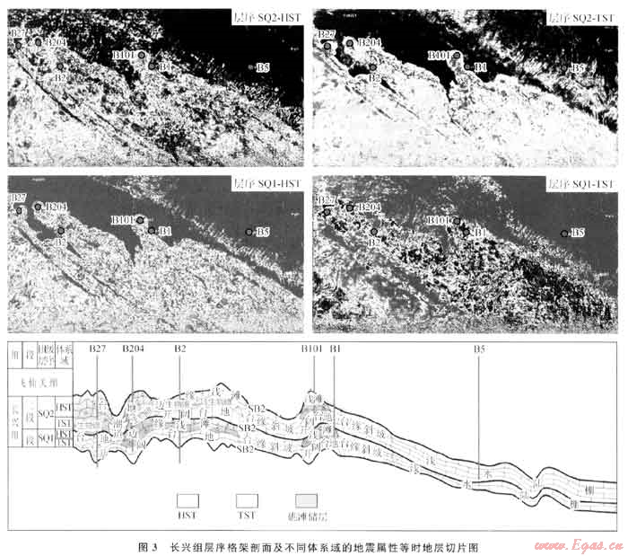 圖3是在長興期層序格架劃分基礎(chǔ)上,對兩個Ⅲ級層序中控制儲層發(fā)育的體系域進(jìn)行地震屬性的等時地層切片,能較好地反映了長興組礁、灘體的發(fā)育和演化規(guī)律。長一段下部為海侵體系域(SQ1-TST),B1井及以西地區(qū)為開闊臺地相沉積,B1井以東相變?yōu)榕_地邊緣斜坡陸棚沉積,儲層不發(fā)育。長一段上部為高位體系域(SQ1-HST),B5井西南地區(qū)為臺地邊緣淺灘相沉積,淺灘相儲層發(fā)育;B1井以東相變?yōu)榕_地邊緣斜坡陸棚沉積,地層薄,儲層不發(fā)育。長二段下部為海侵體系域(SQ2-TST),B5井以西南地區(qū)為開闊臺地相沉積,局部地勢較高部位(如B101井)發(fā)育生屑白云巖儲層;B1、B5井以東地區(qū)相變?yōu)榕_地邊緣斜坡 陸棚沉積,儲層不發(fā)育。長二段上部為高位體系域(SQ2-HST),B5、B1井以西南地區(qū)為臺地邊緣礁灘沉積,儲層發(fā)育,物性好、厚度大、分布廣;B1、B5井以東地區(qū)相變?yōu)榕_地邊緣斜坡-陸棚沉積,儲層不發(fā)育。因此,長興組的儲層明顯受到沉積體系域的控制,主要發(fā)育在高位體系域內(nèi)的臺地邊緣礁灘相中,并且表現(xiàn)為早期以灘相沉積為主,晚期以礁相沉積為主,平面上具有前礁后灘的特點。