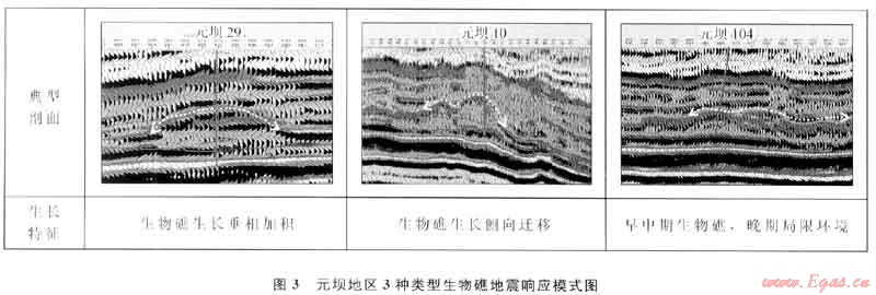通過對(duì)元壩地區(qū)鉆錄井和三維地震資料的綜合分析,依據(jù)生物礁特征劃分提出了3種類型的生物礁:垂向加積生物礁、側(cè)向遷移生物礁及早期生物礁(圖3),3種生物礁的生長與儲(chǔ)層發(fā)育均具有顯著特點(diǎn)。在該認(rèn)識(shí)的指導(dǎo)下,提高了生物礁描述及井位優(yōu)選精度,保證了勘探部署井的高成功率。