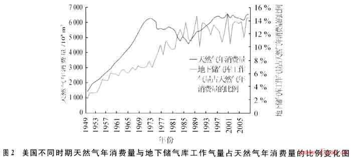 7) 市場對地下儲氣庫工作氣量需求會隨天然氣消費增長而持續(xù)增長,由于地下儲氣庫建設(shè)周期長,工作氣量的建設(shè)高峰期往往滯后于天然氣消費量高峰期。以美國為例,天然氣消費高峰期為1973年,天然氣年消費量達6000×108m3,但同期地下儲氣庫工作氣量僅200×108m3,不到天然氣年消費量的6%。但到了1990年前后,地下儲氣庫工作氣量就達到了1200×108m3左右,占天然氣年總消費量的15%。美國不同時期天然氣年消費量與地下儲氣庫工作氣量占天然氣年消費量的比例變化情況如圖2所示。