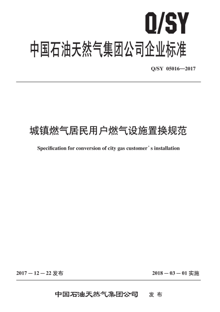 城鎮(zhèn)燃?xì)饩用裼脩羧細(xì)庠O(shè)施置換規(guī)范Q/SY 05016-2017