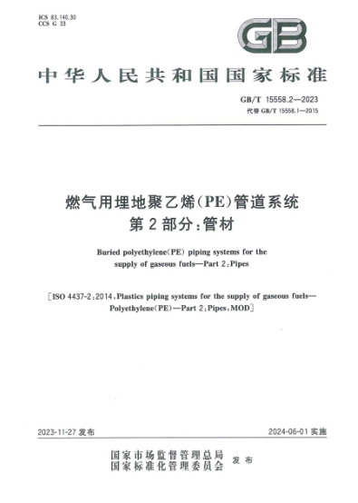 燃?xì)庥寐竦?a href=http://m.jzdxkj.com/e/tags/?tagname=%E8%81%9A%E4%B9%99%E7%83%AF target=_blank class=infotextkey>聚乙烯(PE)管道系統(tǒng) 第2部分:管材GB/T 15558.2-2023